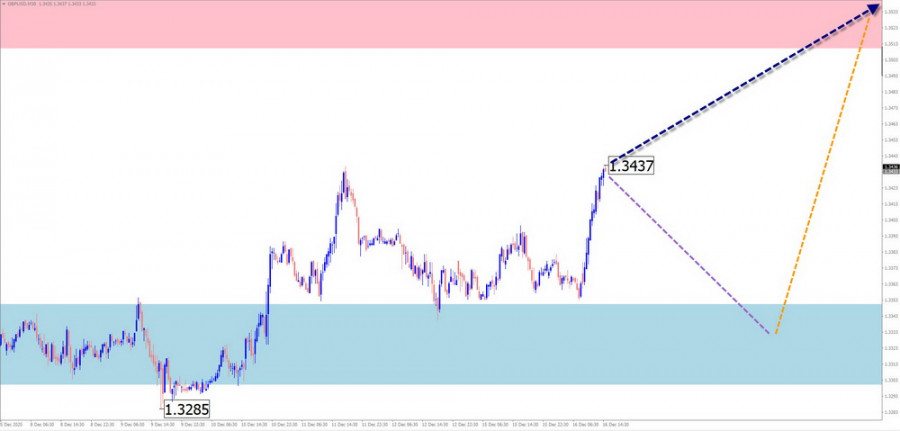 В первой половине предстоящей недели ожидается продолжение общего бокового вектора движения британского фунта. Возможно снижение, не далее нижней границы расчётной поддержки. Рост активности и возобновление восходящего курса наиболее вероятно к концу недели.