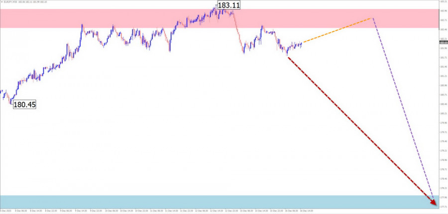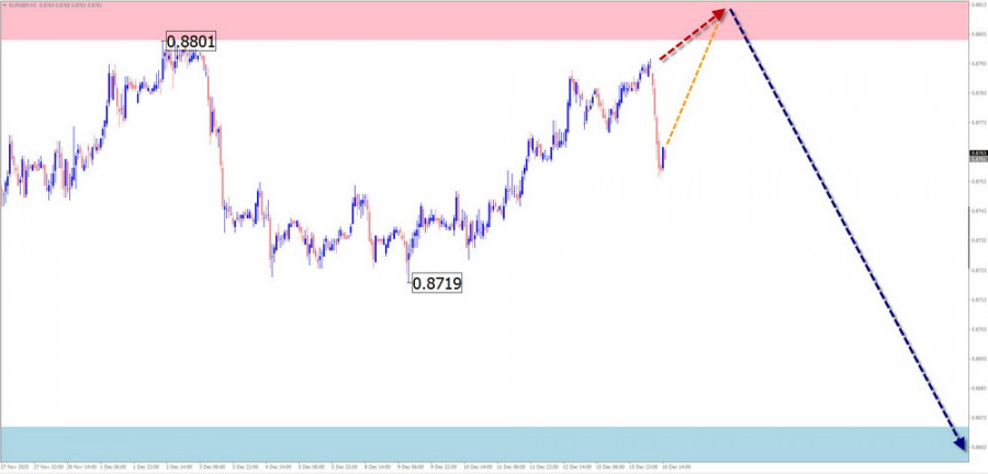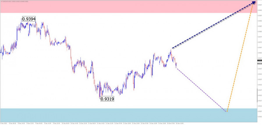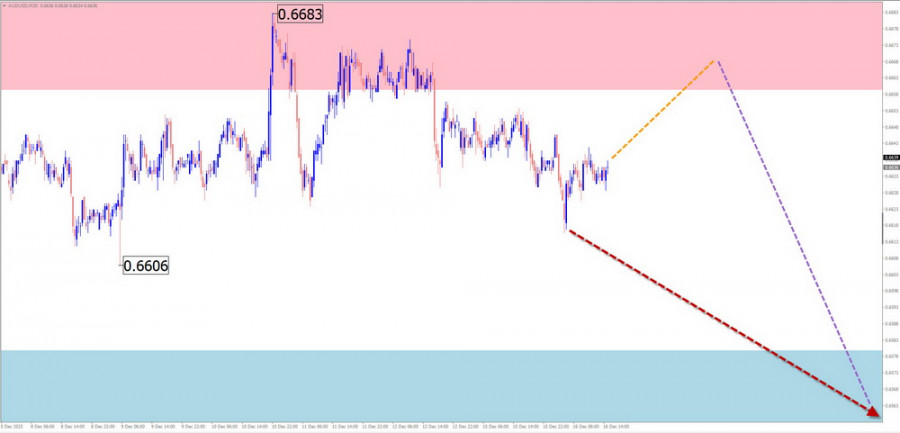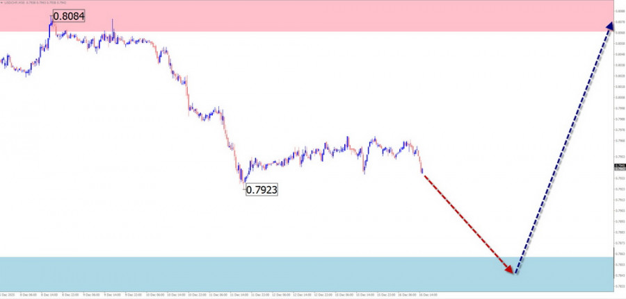 В начале текущей недели ожидается флетовый настрой ценовых колебаний. Возможен откат к границам зоны сопротивления. Далее можно ждать формирование разворота и возобновление ценового снижения, вплоть до уровня расчетной поддержки.